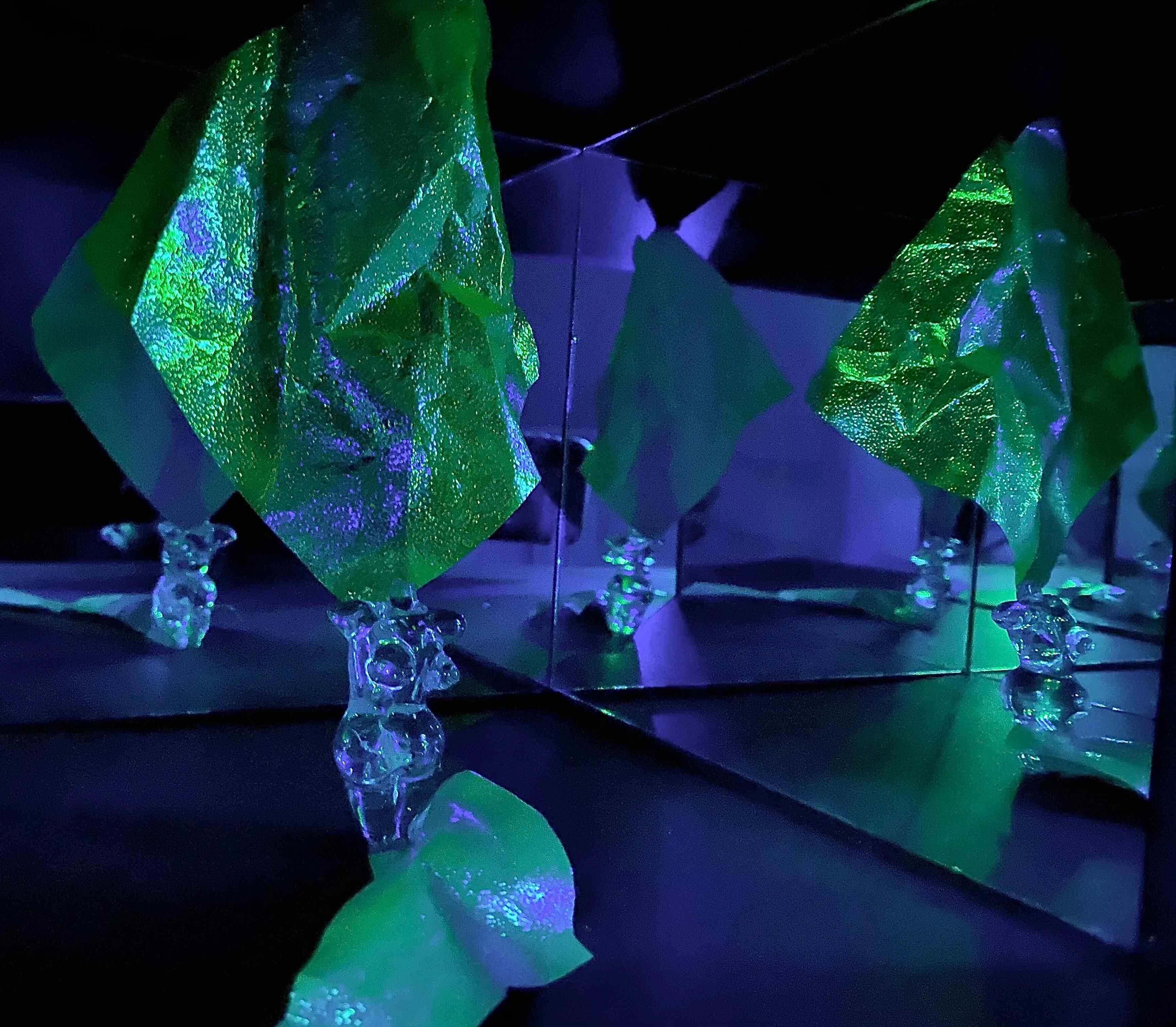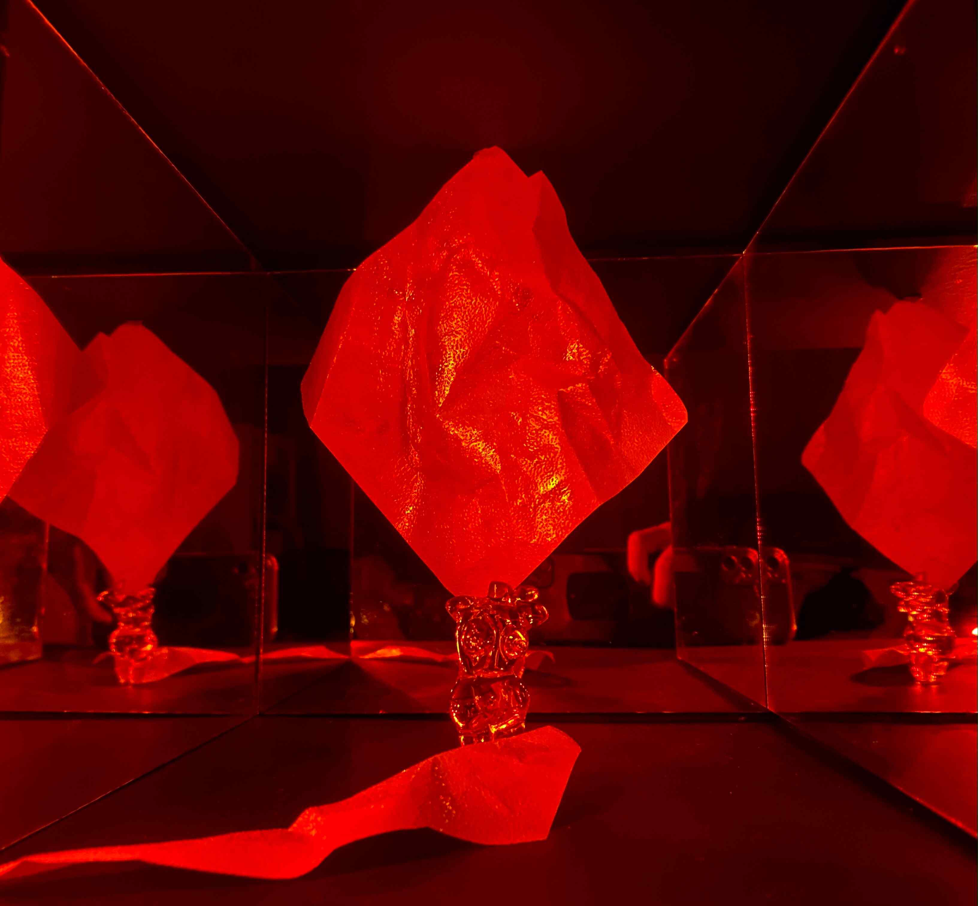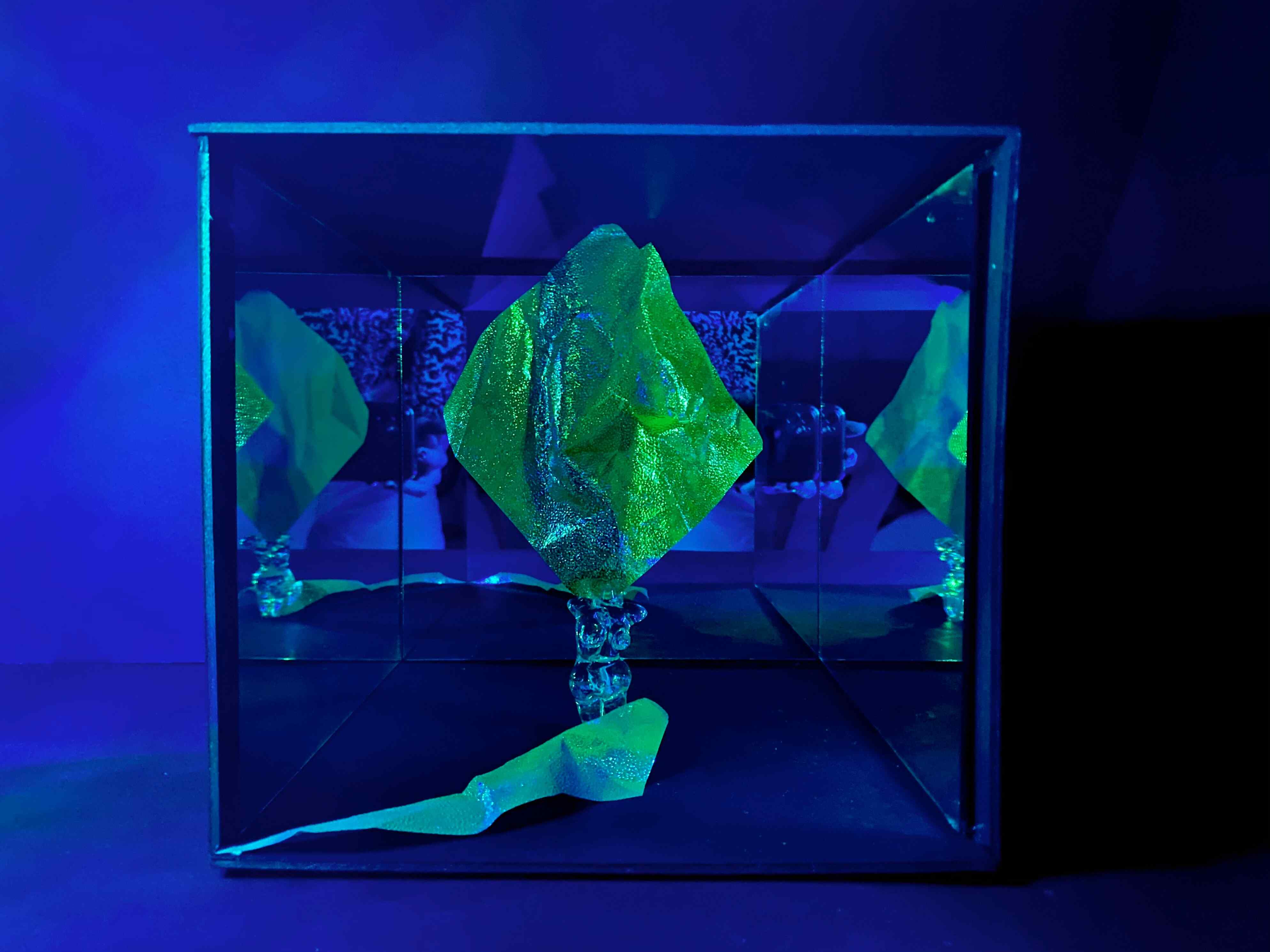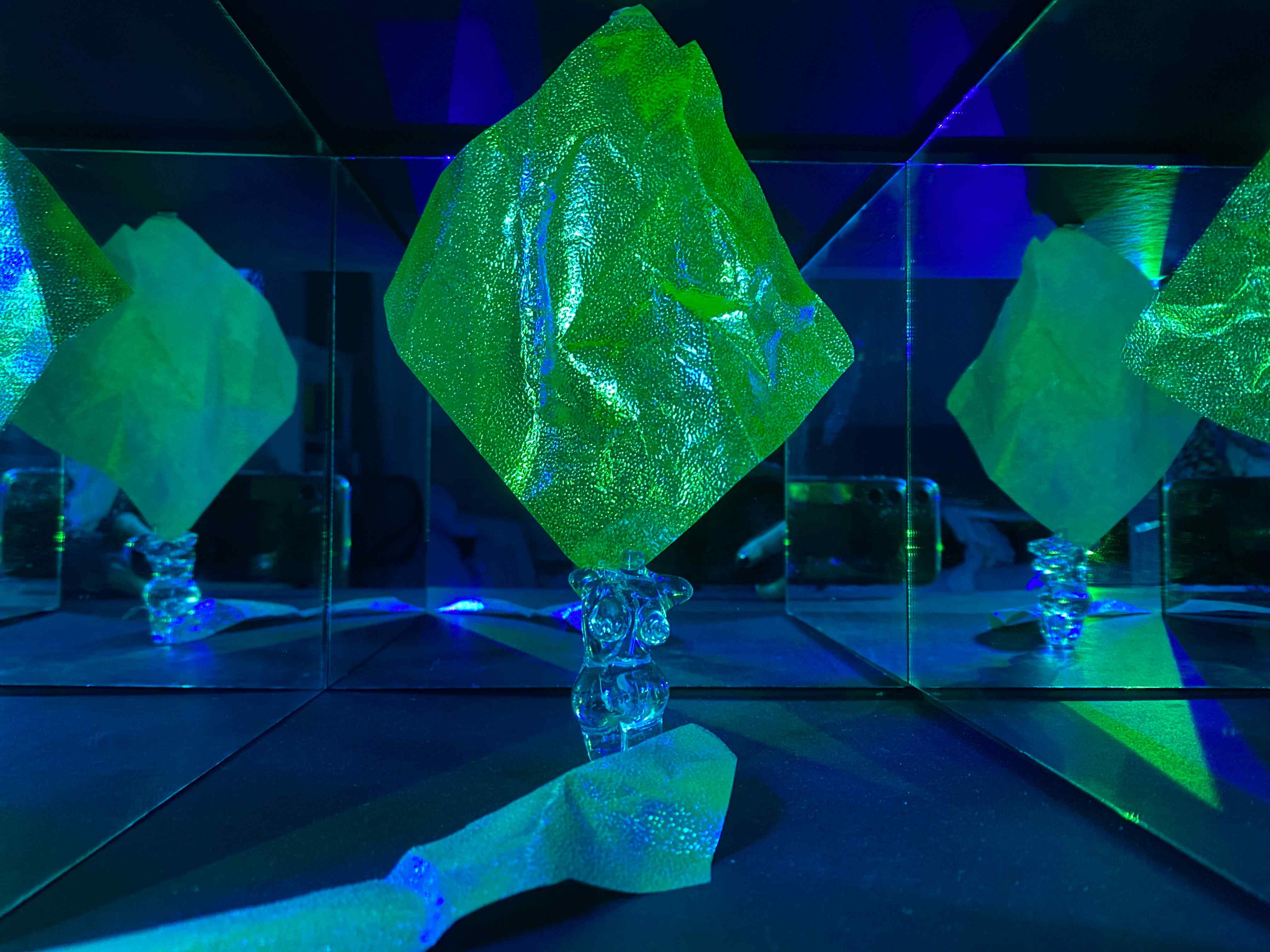 Certainly, humans have a prominent connection with the spaces surrounding them. We reflect our unique personalities and energy into environments we enter and in return the space reflects it back to us. Inspired by this relation of our unique aura and environments, I have created this lighting installation. This installation is initially presenting a curious object in the dark but as the viewer gets closer, they experience a new environment formed by the human figure and its changing aura. Surrounding mirrors distort this aura back to the human figure and to the viewer. This is the ongoing relationship between aura and environment...