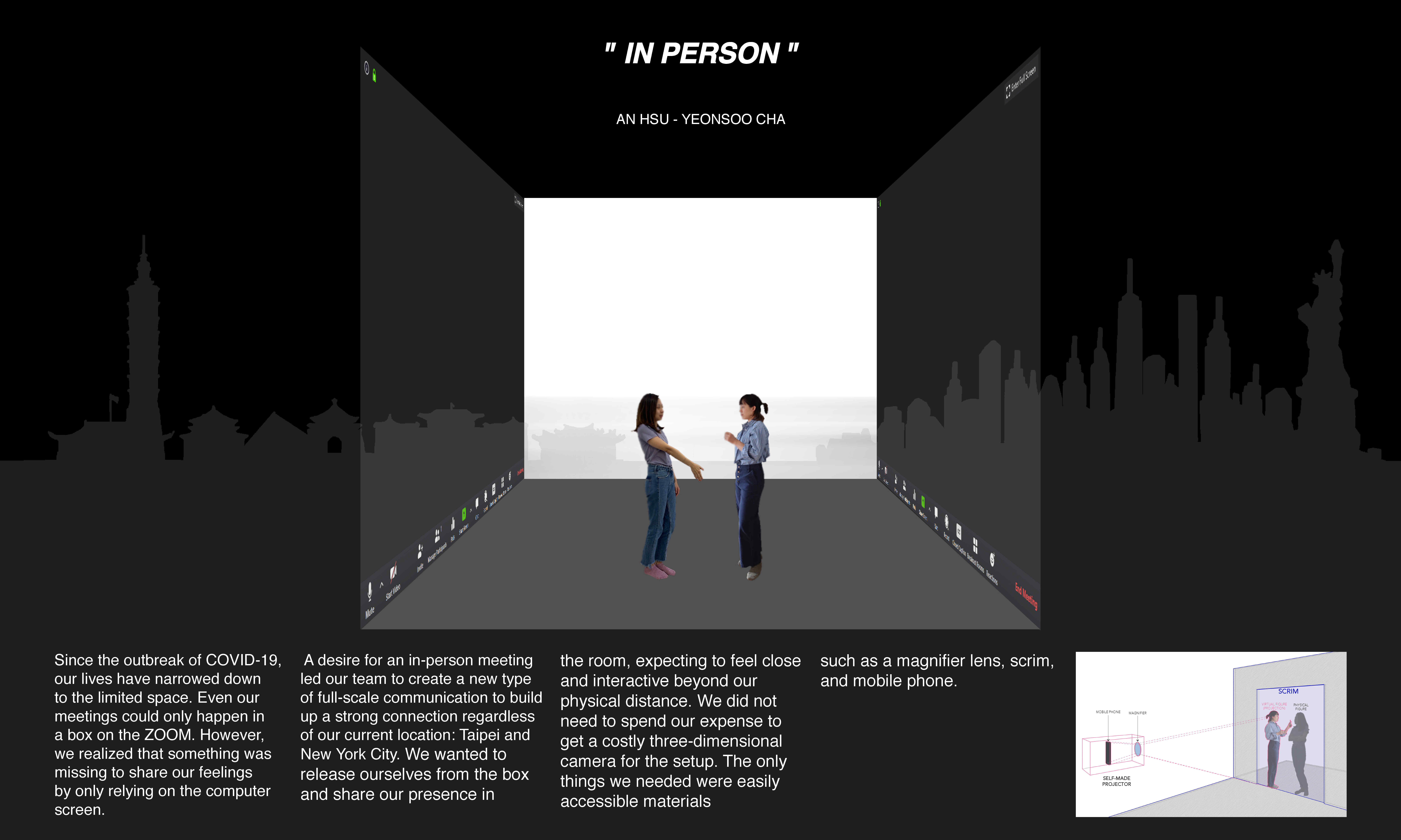 Since the outbreak of COVID-19, our lives have narrowed down to the limited space. Even our meetings could only happen in a box on the ZOOM. However, we realized that something was missing to share our feelings by only relying on the computer screen. A desire for an in-person meeting led our team to create a new type of full-scale communication to build up a strong connection regardless of our current location: Taipei and New York City. We wanted to release ourselves from the box and share our presence in the room, expecting to feel close and interactive beyond our physical distance. We did not need to spend our expense to get a costly three-dimensional camera for the setup. The only things we needed were easily accessible materials such as a magnifier lens, scrim, and mobile phone.