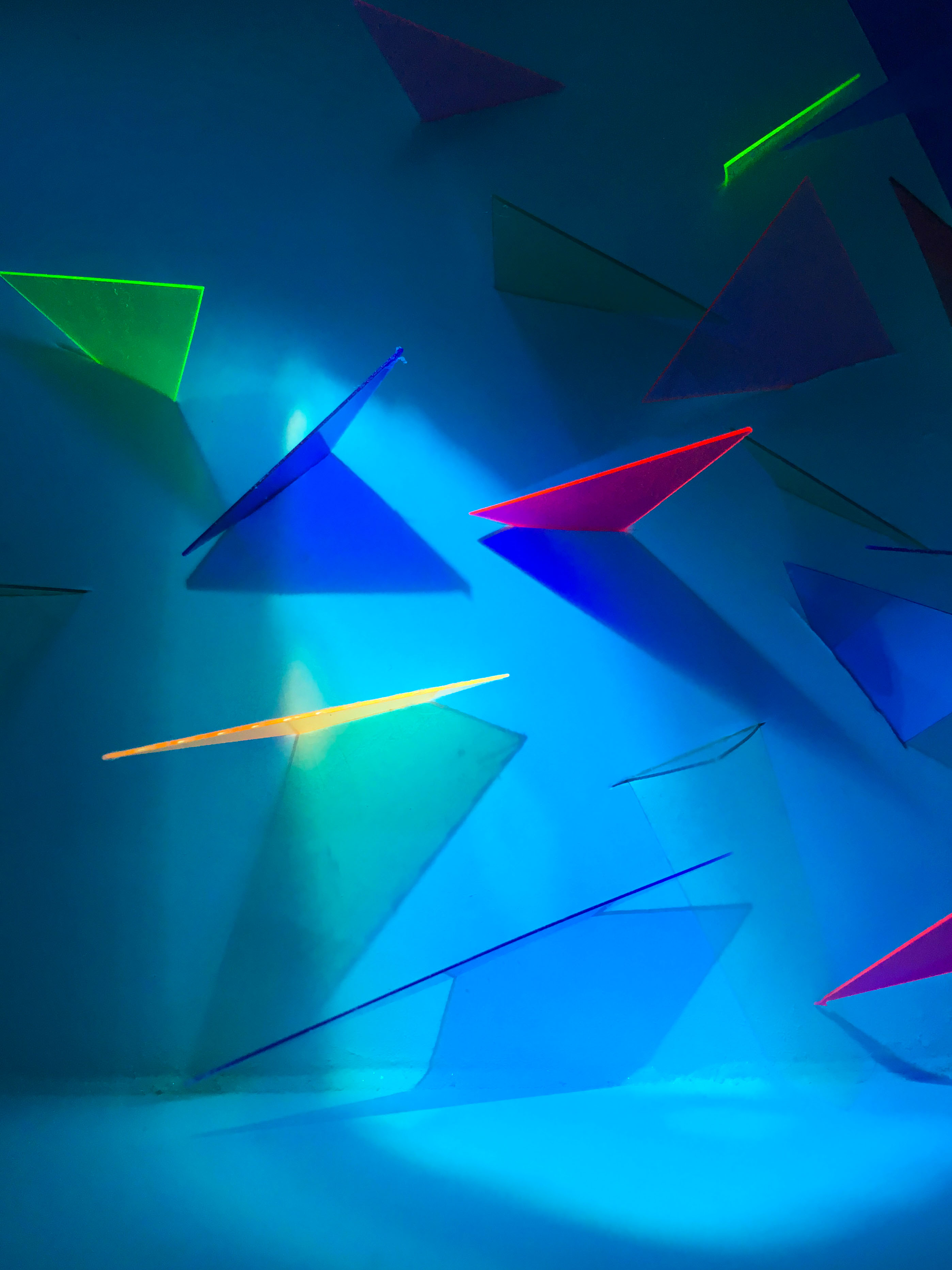 Sensory Sensitivity simulates the experience of light for children with autism. Harsh artificial lights are a daily source of lasting emotional and physical pain. The chaotic flashing and overlapping shadows serve to generate that experience of plummeting mood and energy. Contrary, mood lights of certain colors bring creativity and calmness. The textured ambient blue light brings us to a sensory room, where the shadows navigate and encourage interaction.