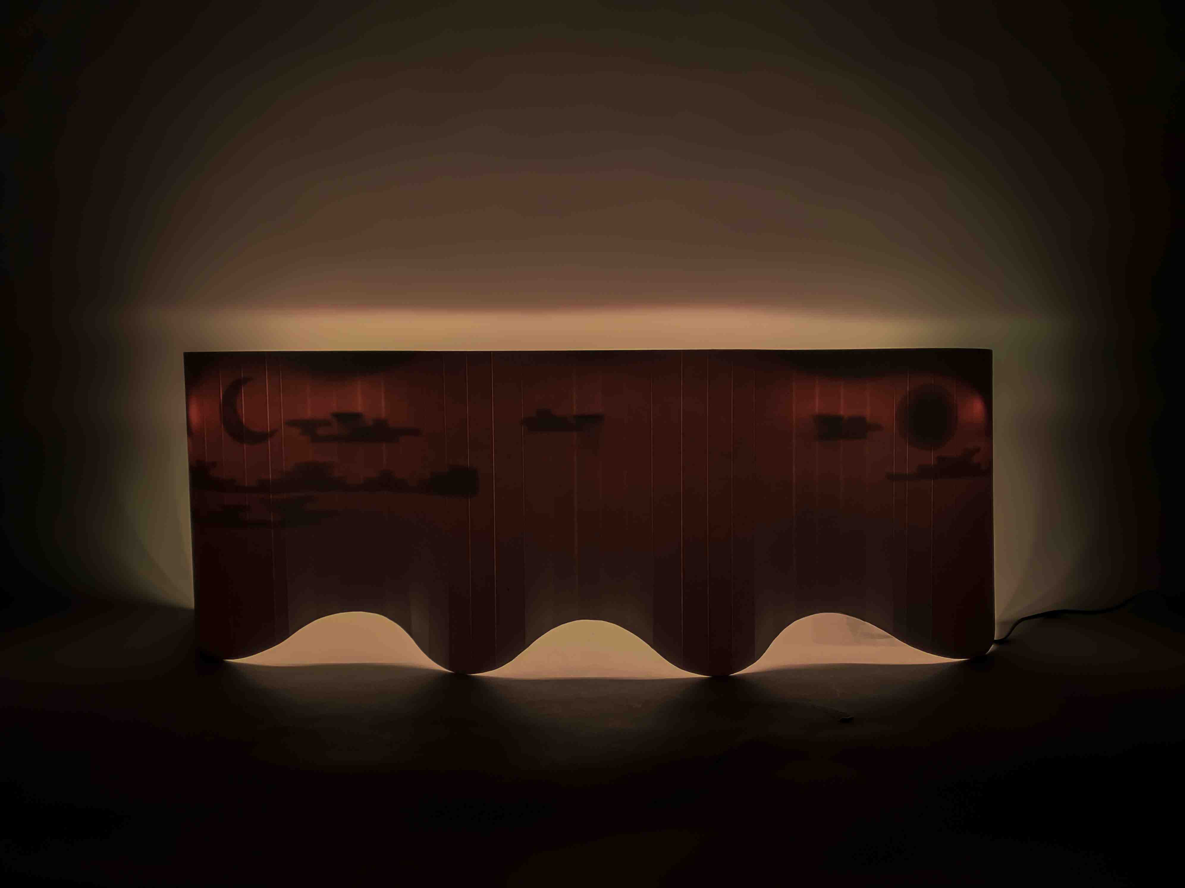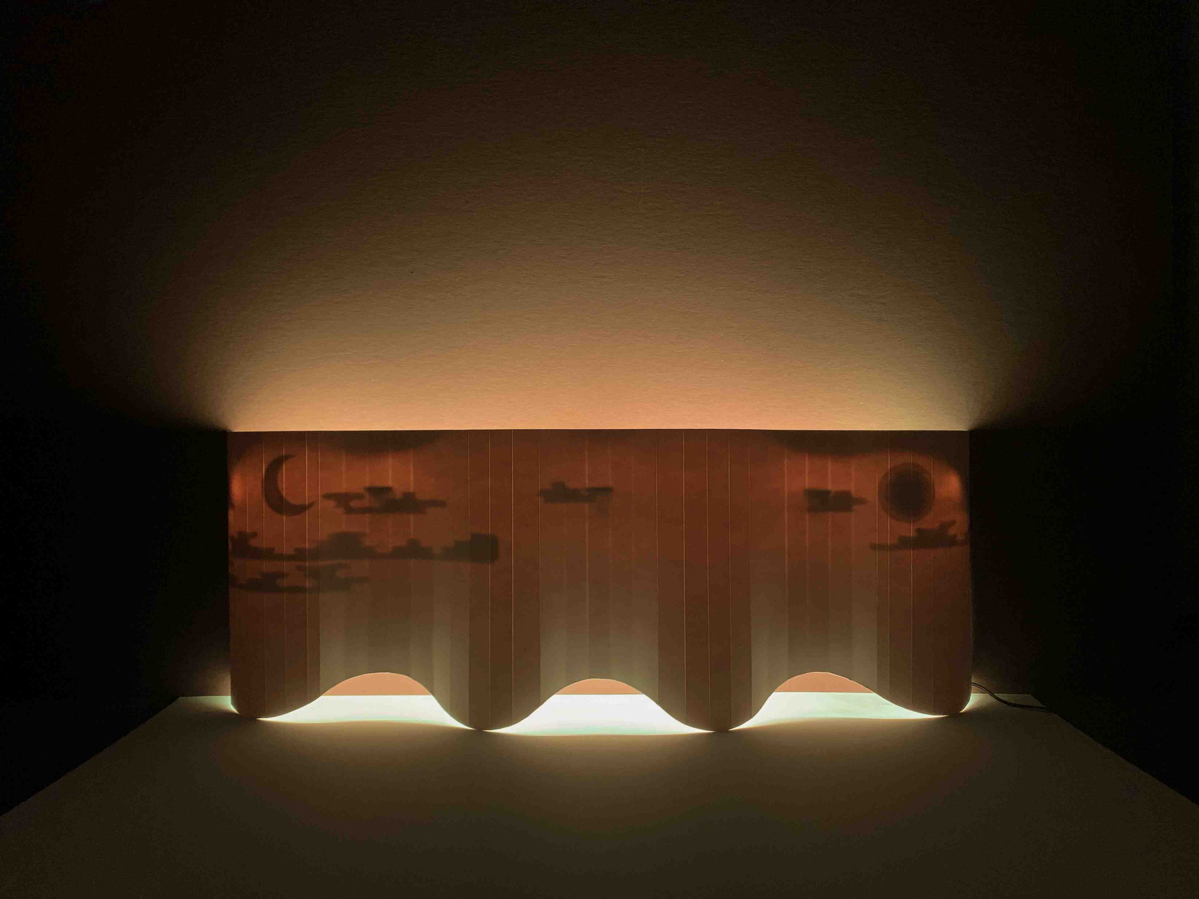 This is the most boring winter break that I have ever experienced in my life. As an international student, considering the risk of not being allowed to return to the US, I chose to stay in Brooklyn for this special break during the pandemic. I wake up on my bed, sitting lazily and appreciating the sunshine squeezing itself from that gap between the curtain and the window, casting on my forehead, wondering: what on earth could be funnier than staying bored? The same drama repeated itself every day from the sunrise to the sunset. And I started to realize that the ability of realizing and enjoying boringness is actually a gift to us. Inspired by staring at the natural light shooting from the window to the curtain, I used some super achievable paper boards and LED light strip to recreate that meditative feeling when I was thinking about the miracle of boringness from day to night. The projection of the sun, the moon, and the cloud is inspired by traditional Chinese table screens. The aim is to build an environmental light effect on the working desk that could accompany the users whenever they feel bored and to remind them of the fun and precious part of boredness.